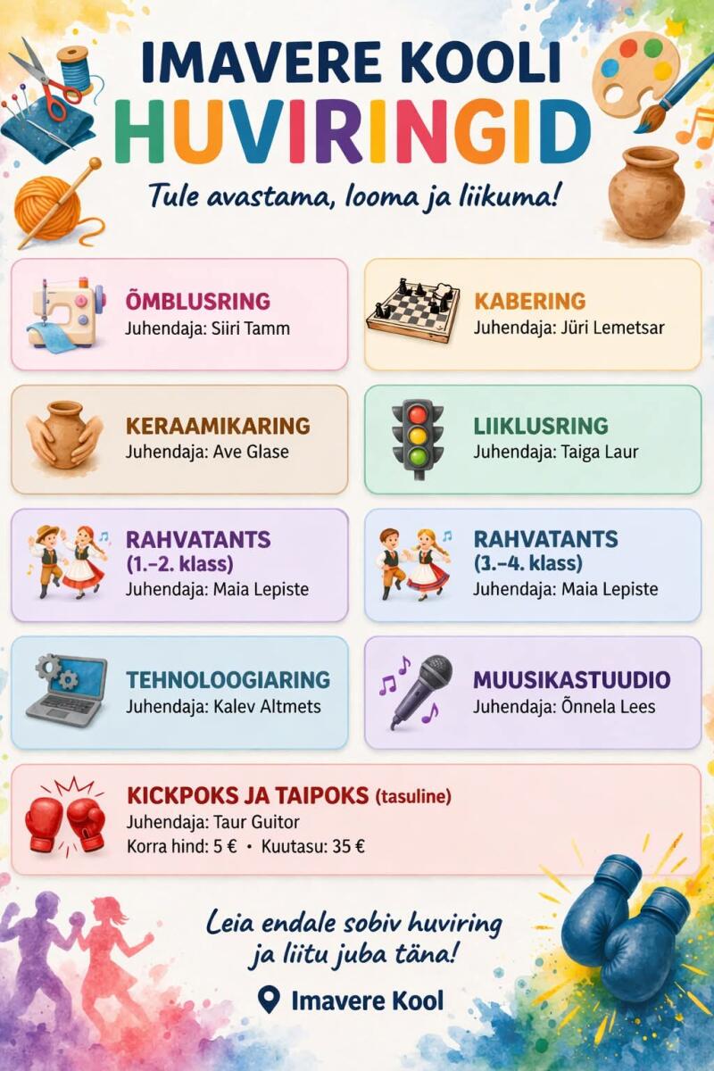 2025/2026 õa toimuvad kooli huviringid. Vali endale huviring ja tule uudistama! Ava foto Viimati muudetud 25.03.2026.