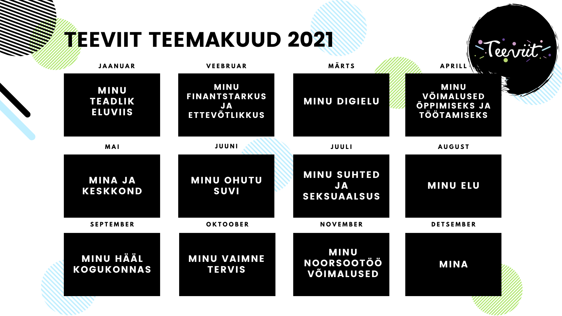 Teeviit keskendub igal kuul konkreetsele teemavaldkonnale. Veebruarikuu teemakuulink opens on new page on finantsteadlikkus, mil noortele jagatakse väärt teadmisi oma raha teenimisest, kuludest ja maksudest, eelarve koostamisest, investeerimisest ja paljust muust, mis nende igapäevaelu teadlikkust tõstab. Lisaks pakume noortega töötavatele spetsialistidele võimalust osaleda noorteinfo teemalises lühiloengus ja töötoas.