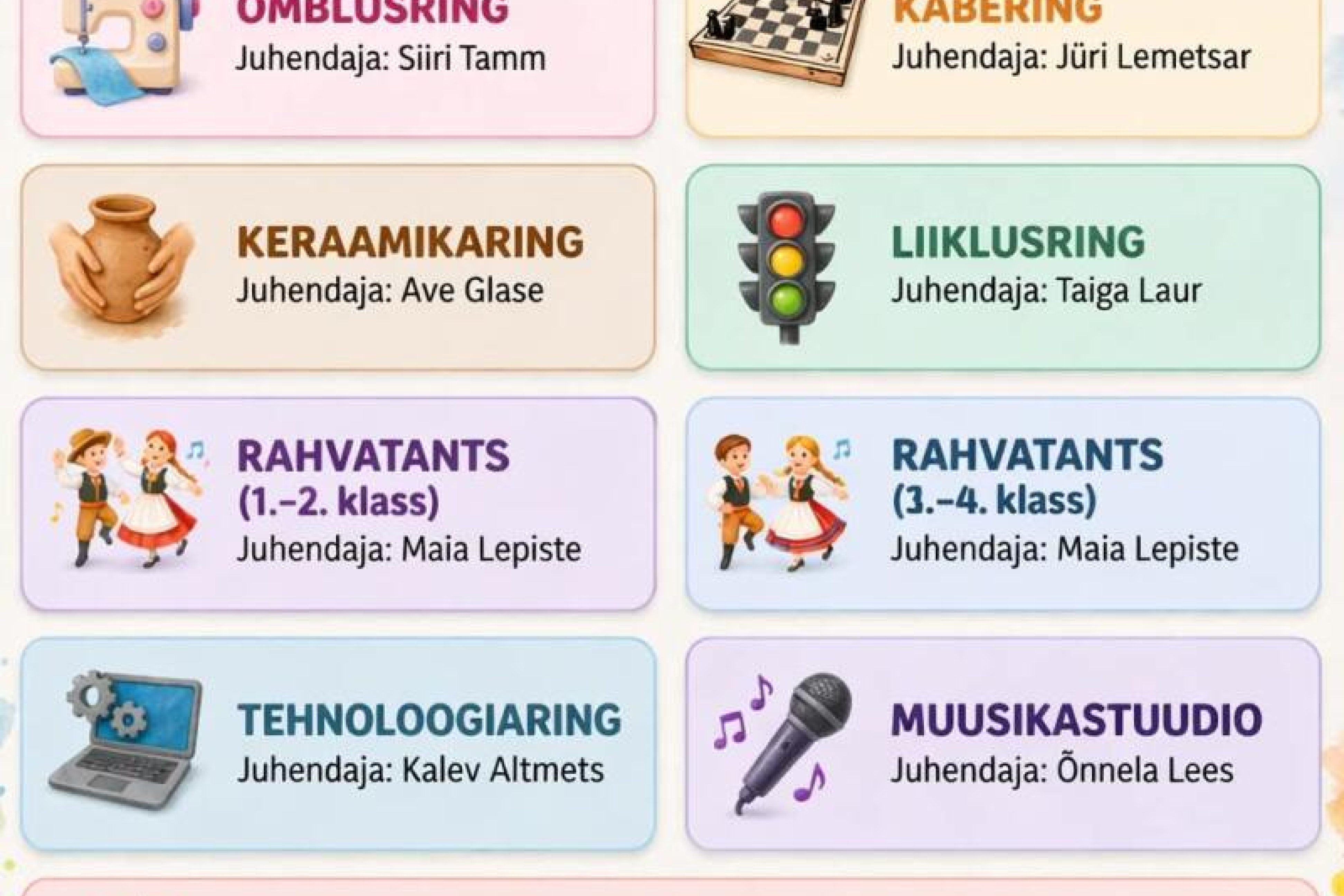 2025/2026 õa toimuvad kooli huviringid. Vali endale huviring ja tule uudistama! Ava foto Viimati muudetud 25.03.2026.