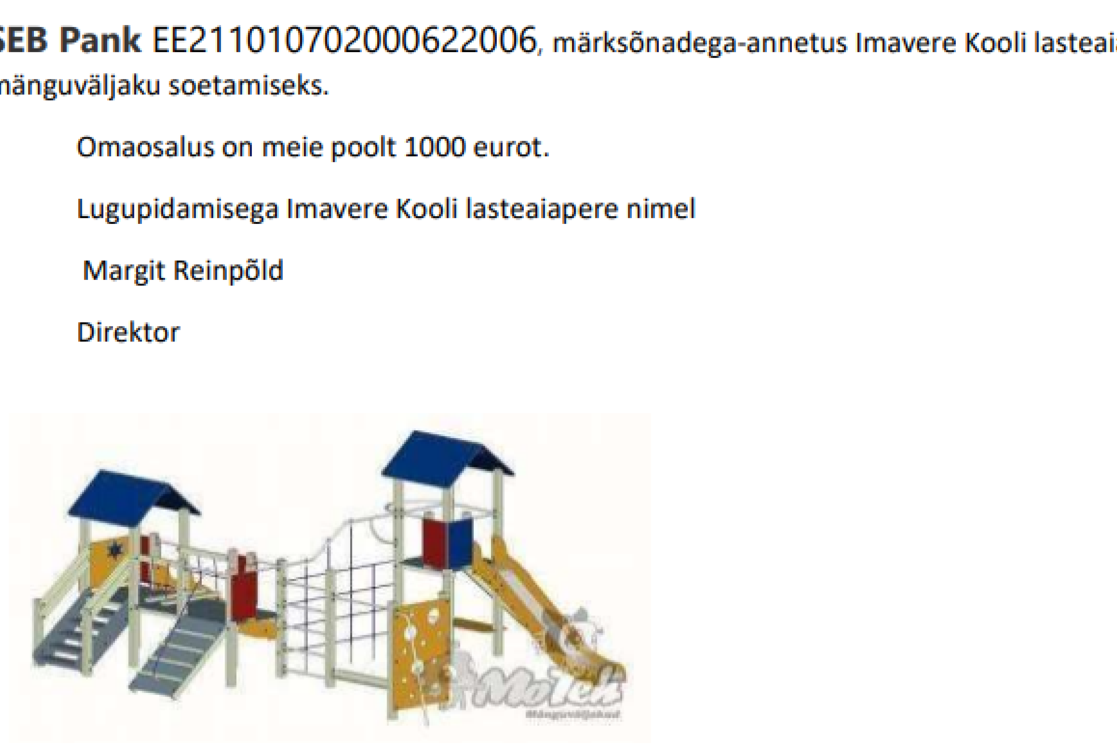 Lugupeetud ettevõtlik ja heasüdamlik firma, eraisik! Hea Imavere Kooli lasteaiapere palub abi lasteaia õuele mänguväljaku soetamiseks. Tahame pakkuda oma mudilastele rõõmu, kaasaegset ja huvitavat mänguelamust, õue minemise ootust ja säravate silmadega lasteaiajütside tegutsemist vahval mänguväljakul. Tulevikus võib sellest samast mängulustijast saada Teie ettevõttesse tubli töötaja või tööandja. Mänguväljaku olemasolust saaks rõõmu tunda Teie töötaja laps, hea sõbra või sugulase perekonnas elav koolieelik. Kajastame sündmust ja mainime toetajaid ajakirjanduse vahendusel, sotsiaalmeedias, pakume kooliruume seminarideks. Oleme väga tänulikud, kui aitate meie Kaisumõmmidel, Marumõmmidel ja Müramõmmidel oma unistus täita! Kõikidele nõuetele vastava mänguväljaku maksumus on 8798 eurot koos paigaldusega. Toetava soovi korral palun kanda annetus Järva Vallavalitsuse arvelduskontole SEB Pank EE211010702000622006, märksõnadega-annetus Imavere Kooli lasteaia mänguväljaku soetamiseks. Omaosalus on meie poolt 1000 eurot. Lugupidamisega Imavere Kooli lasteaiapere nimel Margit Reinpõld Direktor