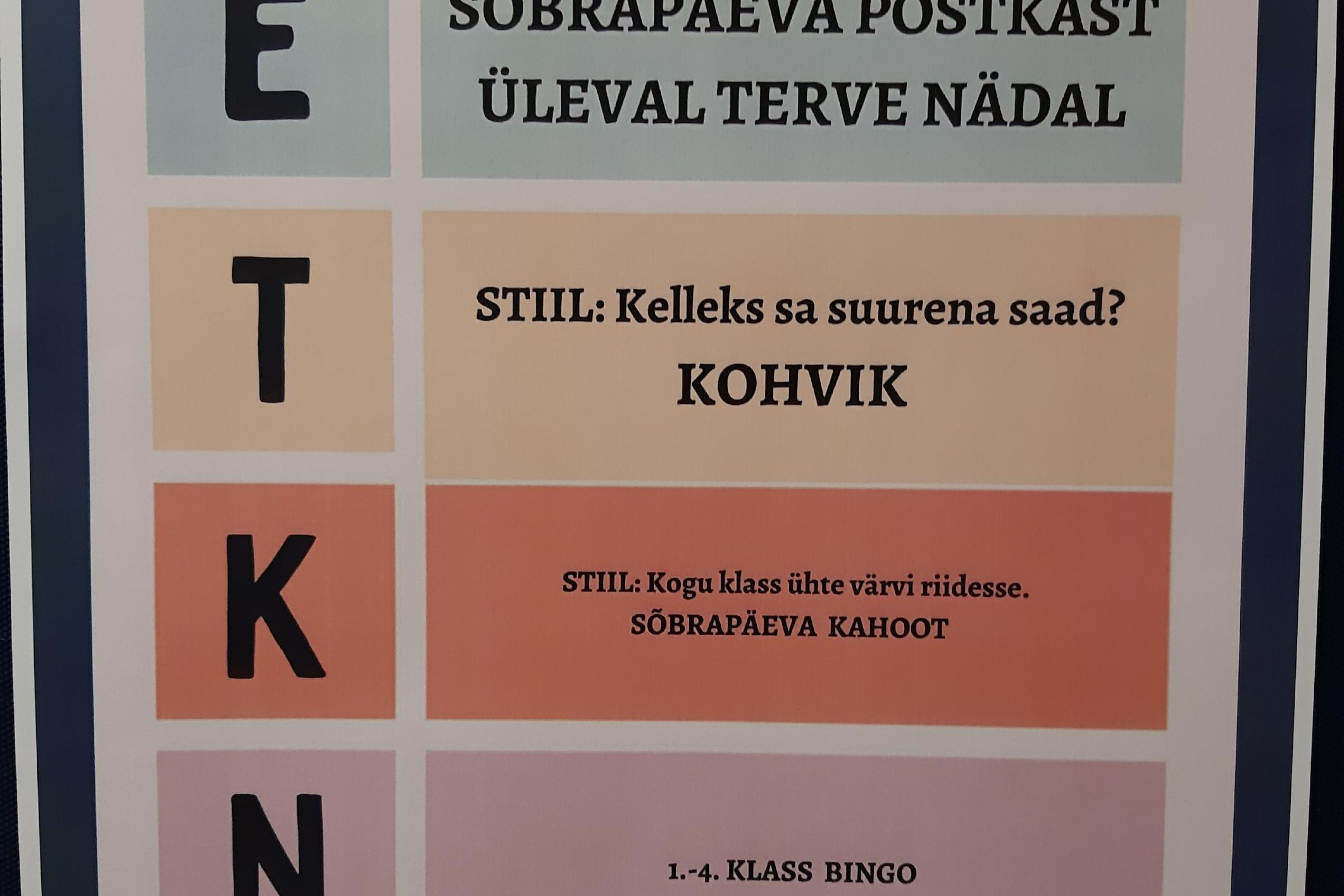 Käimas on sõbranädal: toimub mitmeid põnevaid sündmusi ning stiilipäevi. Lapsed said riietada end selleks, kelleks tahavad tulevikus saada. Vahetundidel oli avatud sõbrakohvik. Mängisime sõbrakahooti!