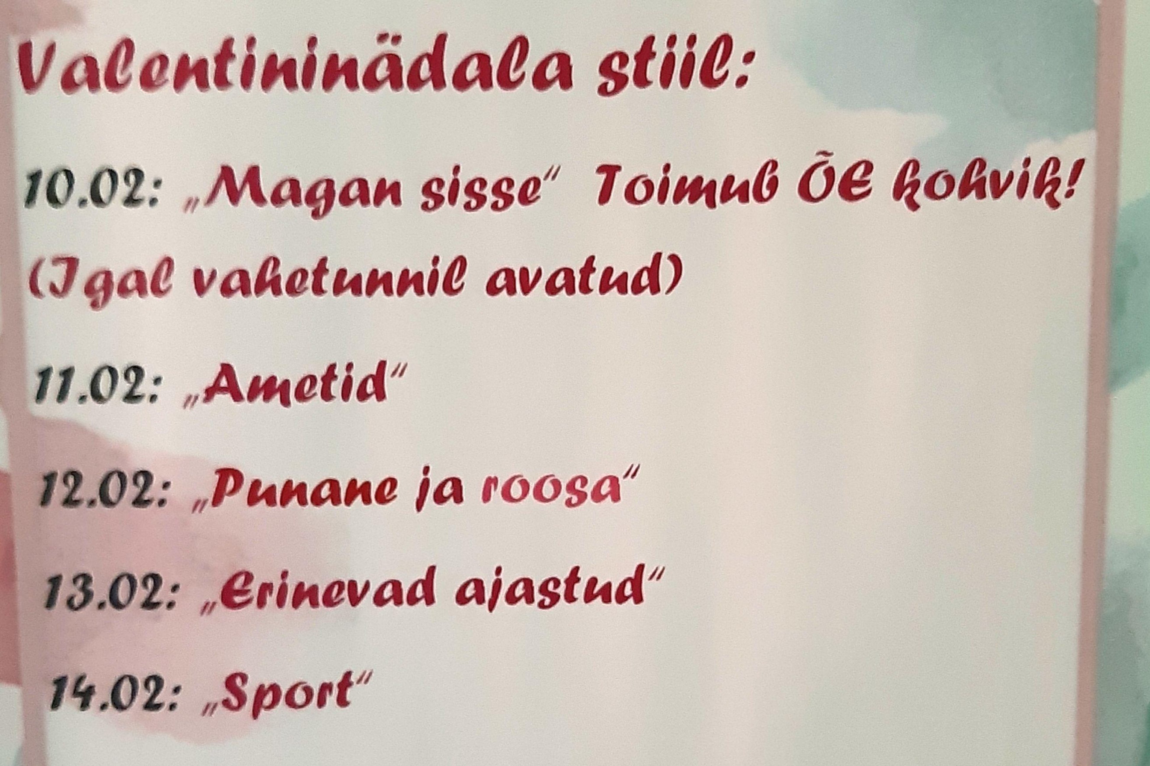 Järgmisel nädalal algab Valentininädal. Plakatil on näha toimuvad sündmused ja palume neist ikka osa võtta. Nii on koolielu mitmekesisem ja huvitavam.